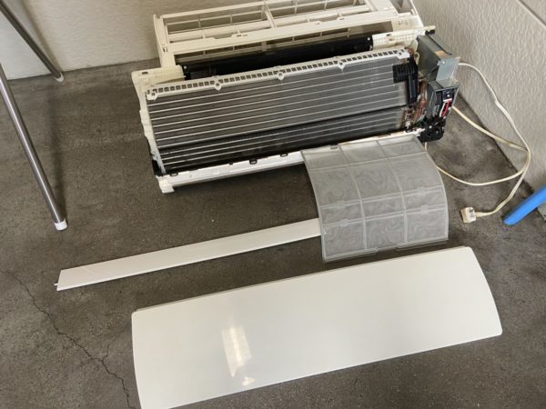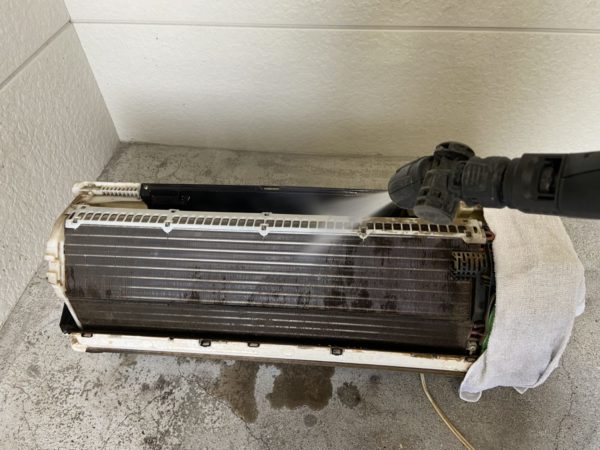 今日、大竹市のプラント施設内にあったルームエアコンを別の場所に移設するとのことで、取り外したルームエアコンを自社に持ち帰り洗浄しました。