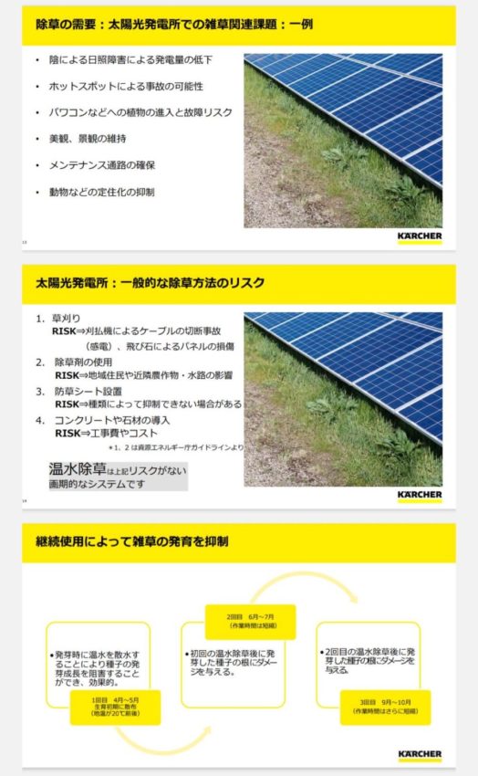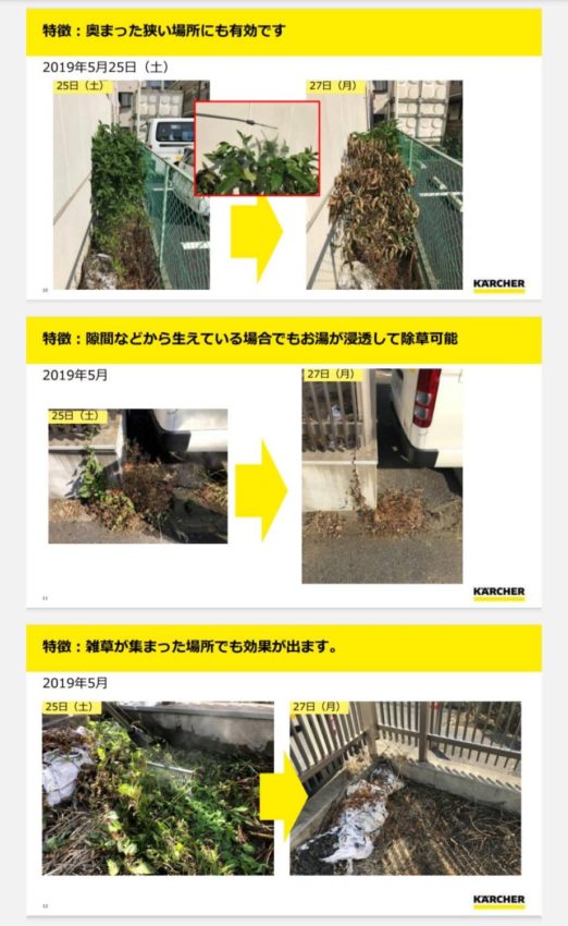 こちらは温水高圧洗浄機という機械を用いて42℃以上の温水を雑草に定期的に散布することにより、育成障害を発生させ除草させることが可能となります。