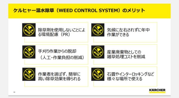 近年環境問題も問題視されつつある中で、除草剤など薬液を撒くことなく温水による除草ですので、環境保全にも取り組むことが出来ます。