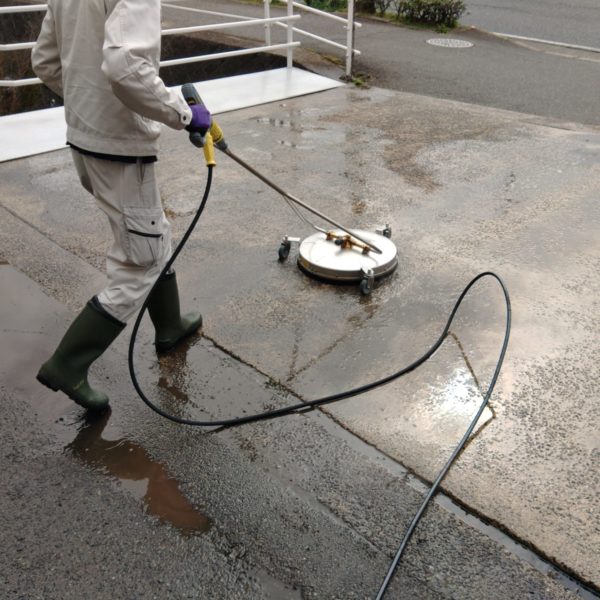 特殊な機械を使い路面の汚れを落としていきます。やはりただの水とは違い、熱湯なので汚れの落ちが違います。