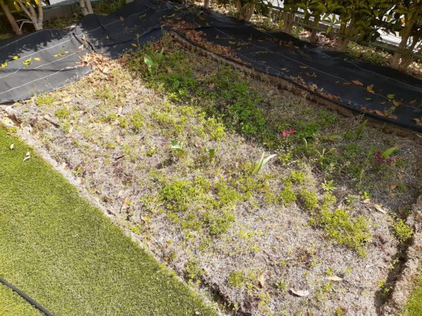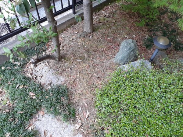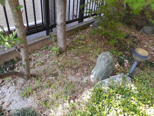写真にある龍のひげという草などは残しておいてほしいとの家主様のご依頼があり、その周辺に生えていた雑草だけ枯れているのが分かると思います。