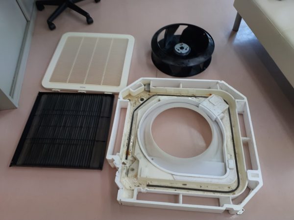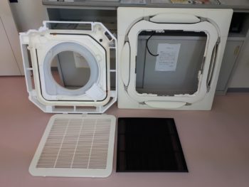 本日作業させていただいたエアコンはこちらの埋め込み型の四方向エアコンです。
