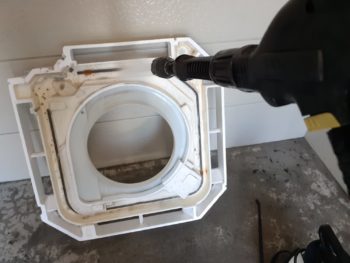 写真の通り細かいところまで丁寧に洗浄作業を行いカビ汚れやホコリ汚れを落としていきます。