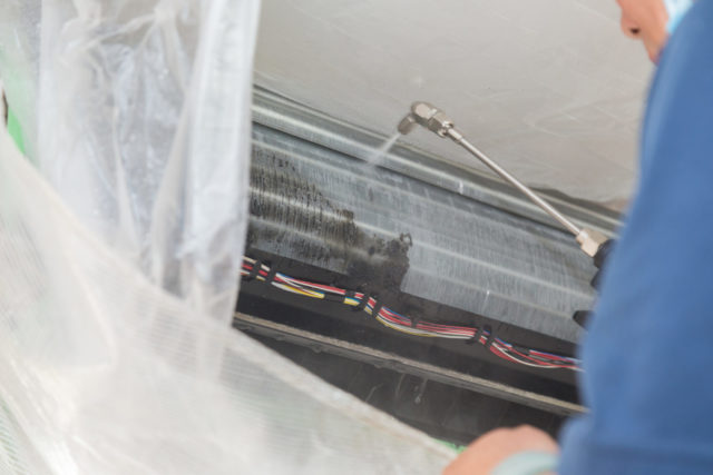 【4】熱交換器部分のカビやホコリを専用の洗剤を使って落とします。